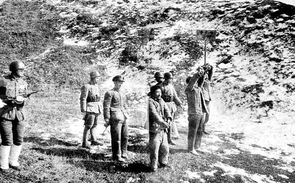 其实,想要成为“朋友”也不是不可能,两千年来的经验告诉我们,把野狼驯服成为家狗的唯一方式,就是杀了它,扔到畜生道里轮回投胎,下辈子做一只好狗。 下为日本战犯处决现场照片 (谷寿夫、中军吉、野田毅、向井敏明松本洁)