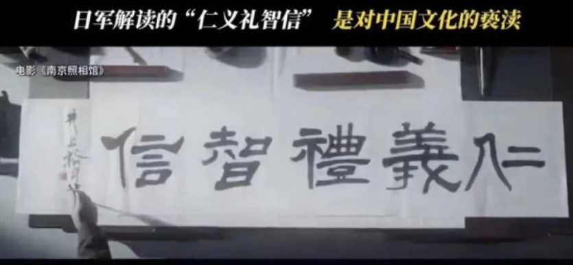 二、中日有可能成为朋友吗? 不能。原因就在于教员说的第二个敌人:军国主义。 军国主义是一种极端化的国家意志,一种将国家机器彻底军事化、奉行对外侵略扩张的文化毒瘤。 在军国主义的逻辑里,人不再是目的,而是实现“帝国伟业”的手段和燃料。“人”的概念被消解,只剩下士兵、资源、征服对象。 电影中日本士兵从开始不敢杀人到后面以杀人为乐,就能看出军国主义为人的异化。 当一部国家机器被军国主义彻底绑架,它便丧失了以“人”的平等、尊重、情感为基础建立“朋友”关系的可能。 因此,军国主义本身,就是友谊与人性的天敌。 电影里看到“仁智礼仪信”的书法真是讽刺。文化上看,日本趴在我们家门口,被我们投喂了两千多年,到头来还是像野生的狼一般,怎么养都喂不熟。而野狼,不同于家狗的明显区分点就是:军国主义