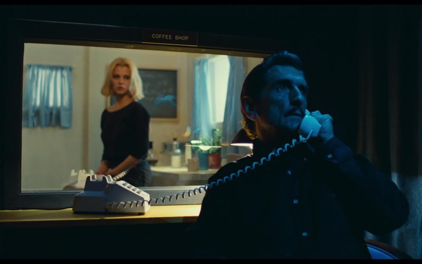 以及对框中框的应用,镜头框之下的另一个框架,这样的镜头设计在影片里设计地很有意味。画面保持理性美感,提升人物塑造的效率,构筑起人物间的隐形关系,这类镜头设计太过于精巧,难度也颇高,对导演的空间感与想象力有着极大考验。 电话戏同样也是一种框中框,这两段戏设置在一家提供色情服务的酒吧,男人走进不同场景主题的小隔间,遇见单面镜后散发着不同风情的女人,他们聊天喝酒,他们释放野性,尽管女人看不见男人,男人对不准女人的眼神。其实追本溯源,镜面拍摄手法的推广始于《天国与地狱》,诸多后来者进行效仿或元素借鉴,但都难以逾越这座最高的山,而《德州巴黎》中的镜面戏是我心目中最能比肩前者的另一高峰。