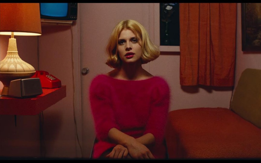 第一场戏,Travis进入隔间,扶着电话,等待着他期盼已久的金发女郎的到来。此时是Jane——全片的戏眼——第一次正面出镜,导演安排声音先行,持续营造暧昧的气氛。镜头随着Travis的眼神抬起戛然而转,在粗制滥造的布景之间穿着艳丽的Jane轻盈亮相,此时T能看见J,J并不清楚对面的那个男人是谁,这样一种奇异的不对称关系设计下,戏剧冲突自然而来,天才的巧思。紧接着就是独属于Jane和Travis二人的相互切换特写长镜头,这一段并不是普通的正反打,而是在台词切入人物内心的瞬间给予演员充分的表演空间。