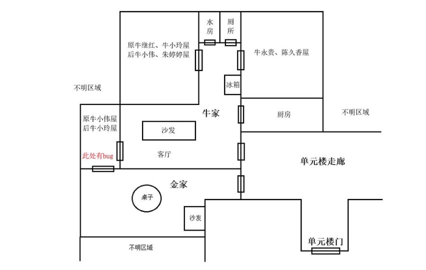 牛家是三室一厅,将大门定为东南向来看,由东向西进大门,门内西侧是客厅,客厅西侧小门里,第一部是牛小伟的卧室,第二部开始是牛小玲的卧室。客厅往北是过道,过道东南小门里是厨房,东北小门里是牛永贵和陈久香的卧室。过道正北靠东是厕所,正北靠西是水房用来洗手、洗衣服、洗澡(No13、18)。过道西边小门里,第一部是牛继红和牛小玲的卧室,第二部开始是牛小伟和朱婷婷的卧室。需要注意的是,牛家的厕所、水房、以及客厅西侧小门里的卧室,整部剧没有出现过内景。特别是,客厅西侧小门里的卧室,实际上跟金家的格局是矛盾的。金家西北小门里的卧室和牛家这个小卧室重合了,应该是布景时的BUG(No11)。从单元门外看,牛家是拐角北侧(单元门右手边)第一个窗户(No2),家里座机号码是5181410(No5)。客厅挂的画,画了三个骆驼,红条上面写的是“厂公会委员会”(No7)。衣服晾在外面,家里用煤气罐(No39)。