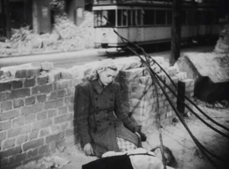 孩子经过被炸毁的教堂时,其中流出的管风琴乐曲将个体的悲剧浑然升华。他时而严肃地止步哭泣,时而又孩子气地嬉戏,甚至以玩具手枪进行了最具讽刺的戏谑,最后他攀爬到废墟的顶端,终于一跃而下-葬身战争的阴霾,与城市的废墟融为一体。影片最后一个镜头依旧颇具回味,和《罗马,不设防的城市》有着异曲同工之处,但不再有奔走的孩子们和远处的希望,一切都在颓废和荒芜中慢慢凝固和沉寂了。在这个摇升镜头中,一位妇人仰身背靠碎石堆,双臂低垂,酷似圣母玛丽亚怀抱基督尸体的图景。