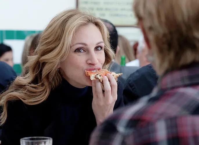 她的第一站是美食天堂意大利。在这里,没有宏大的目标,只有随处可见的诱惑——披萨、火腿、意大利面。她在这里足足胖了20斤。美好的事物确实可以带来能量,在这里,她也回归了自己,恢复了能量。