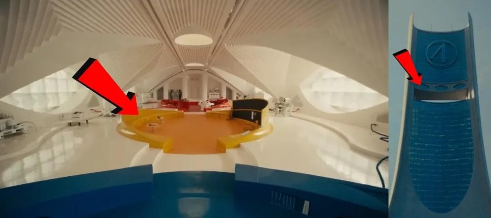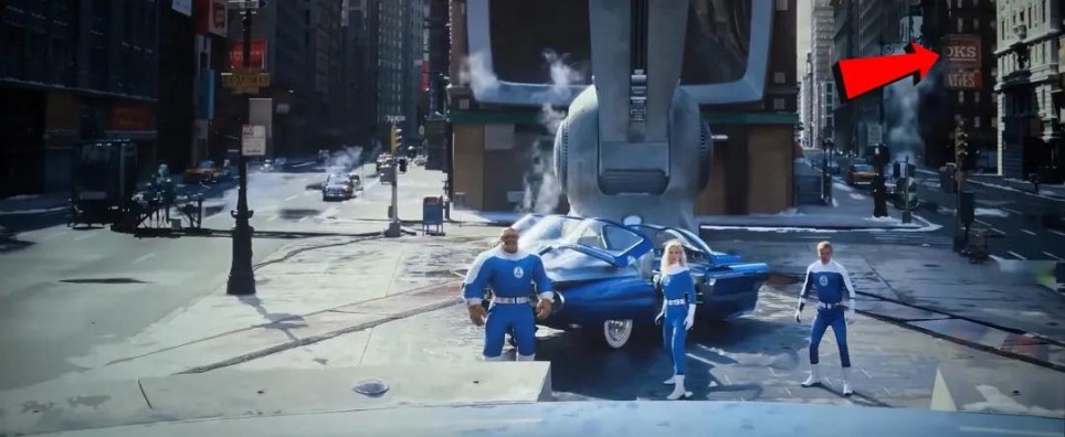 地碑上镌刻的巨怪之战场景,既还原了电影中四侠与巨怪的对决,又复刻了《神奇四侠》创刊号封面设计。