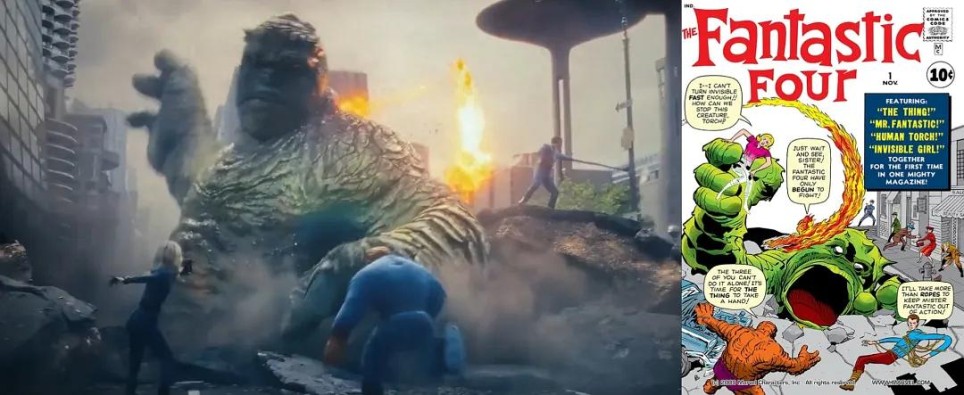 当四侠与"巨怪"交战时,画面完美复刻了1961年《神奇四侠》第1期封面构图。