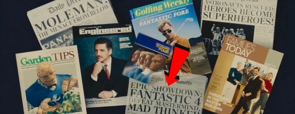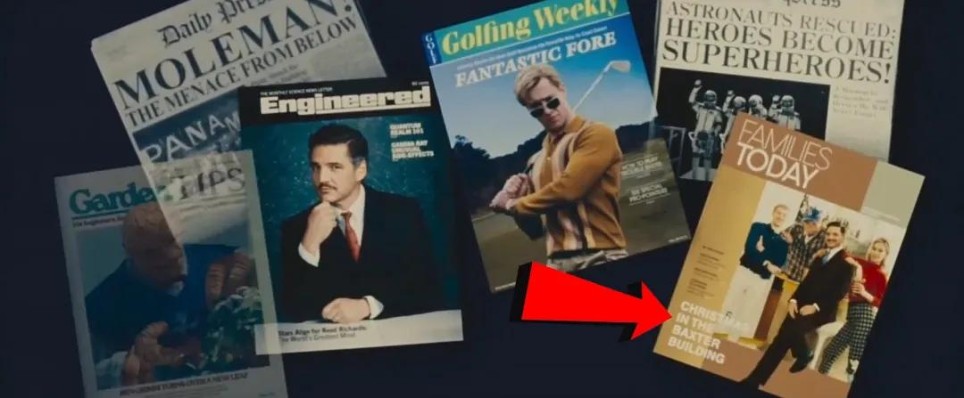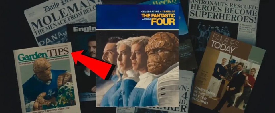 《神奇四侠》情人节海报中,石头人翻阅的《生活》杂志封面是林登·约翰逊,1963年他因肯尼迪遇刺继任总统,暗示即便肯尼迪在这个宇宙幸存,总统之位依然易主。