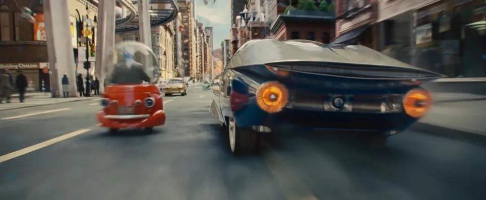 车辆腾空而起时,背景里牵着斑点狗散步的飞行机器人,彰显着这个复古未来世界的设定。