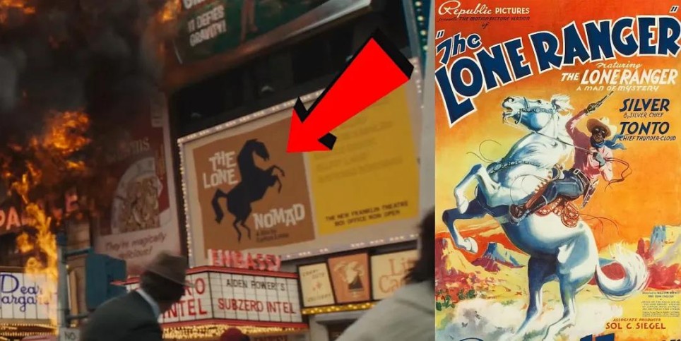 街景中的《孤独游侠》(The Lone Nomad)的电影海报,正是该宇宙的《游侠传奇》(The Lone Ranger),上映于1938年,2013年被翻拍为同名电影《独行侠》(英文名相同),约翰尼·德普主演。
