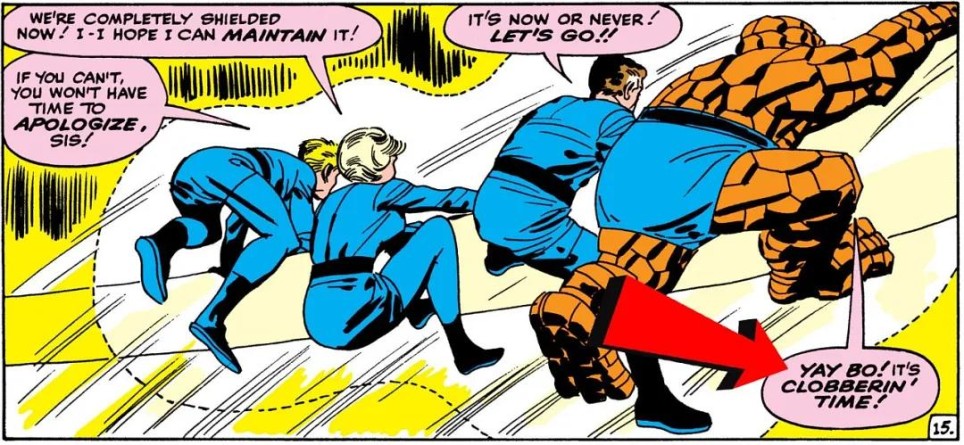 电视中石头人喊出"痛扁时间",这是他的招牌战斗口号,最初出现在1964年《神奇四侠》第22期,彼时他正与宿敌鼹鼠人展开激战。