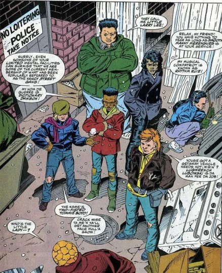 漫画中他们的初代战衣沿用了杰克·科比设计的初代战衣的黑色镶边,四侠大战巨怪、石头人逮捕鼹鼠人时穿的就是这套战衣。