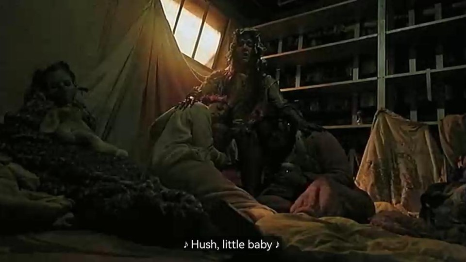 可以判断的出应该是因为丈夫做出了什么行为,导致妻子对生无望而选择带着腹里的胎儿一同上吊。并且通过某种原因变成Mummy,但是她是有实体的所以表明她并不是鬼🤔在两人逃脱“妈咪”的时候不幸被追上,Lacie被折断了肋骨,在支撑不住快要昏迷的情况下,Kaliegh居然没选择逃跑?我的意思是明明可以选择一个掩体躲起来的,结果就只是单纯的坐在摄像机后面等着妈咪前来用歌声带走Lacie? 也许是歌声,也许是因为妈咪的奶具有传染性?Lacie最终也同化成为大人怪婴的一部分。现在这就是整个短片里面最精华的所在。妈咪并没有生气或者继续追杀Kaliegh,而是就单单坐在椅子上,安抚着身边的大人怪婴们。结果随后Kaliegh居然也被同化了。我没有在抱怨,我喜欢致命录像带这种稍微没有逻辑,就只是展现给你看。 不是一个坏结局,并且妈咪唱的歌…还挺伤感的。