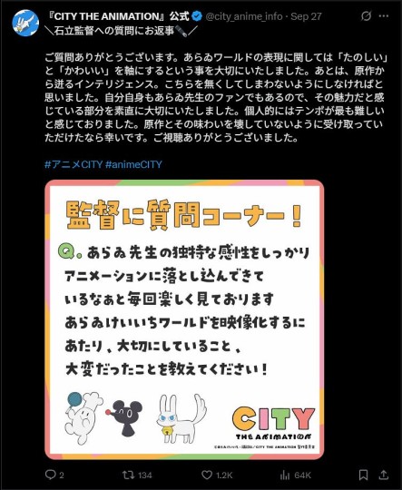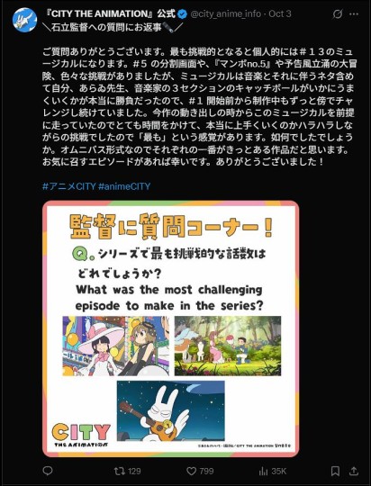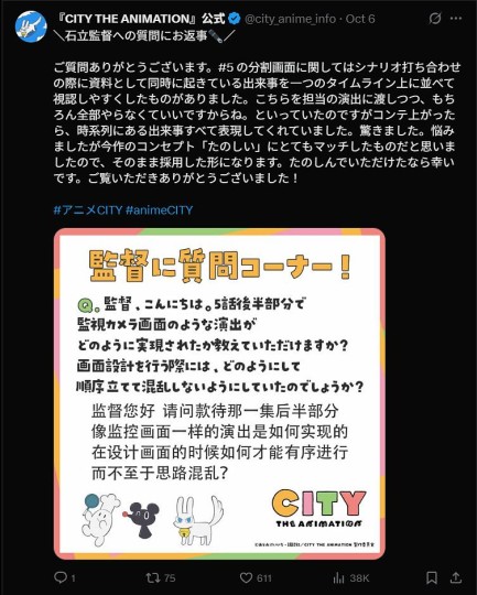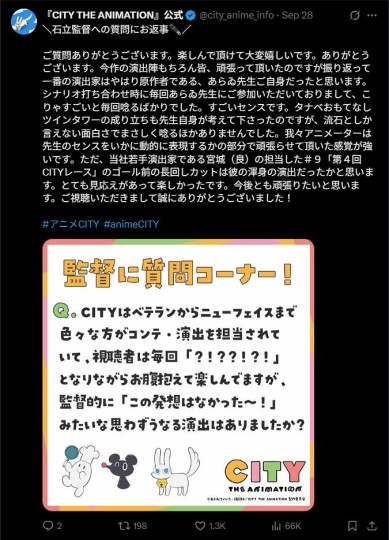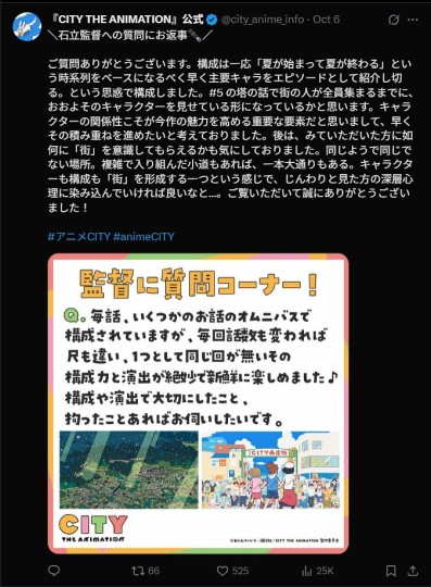 A:片尾曲做成毛绒玩具的定格动画是为了表明这部作品的登场人物并不仅仅是人类,在“CITY”这条街道上生活的所有事物都是故事的主人公。另外,这些角色基本都是以一个从身体斜后方看过去的角度出场的,这是为了给观众留下一些不舍、落寞的感觉。