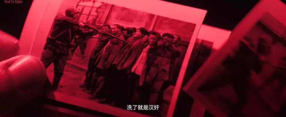 胶片具有的物质性(在赛璐璐时代)提示我们在南京大屠杀的案例中,恐怖影像不是作为娱乐被展现的,而是对历史事实的显影。当屠杀的恐怖场景在阿昌冲洗出的照片中逐渐清晰的时候,我们意识到,电影中出现的血腥场景并不是cult片中无节制的杀戮幻影,胶片/影像让这些杀戮变得沉重。