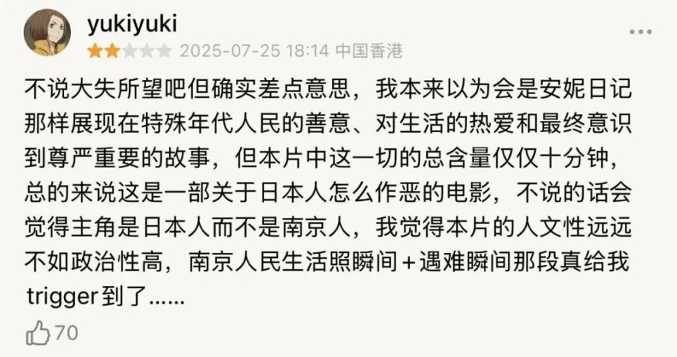 很显然,很多此类的发言只是通过这种指摘来完成他们预设好的判断,即一部有关南京大屠杀的电影必然是“民族主义”以及“宣扬民族仇恨”的。